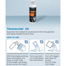 Trimmercide Oil has been specially formulated to keep clipper blades clean and lubricated and works excellently on all clipper blades and scissors.